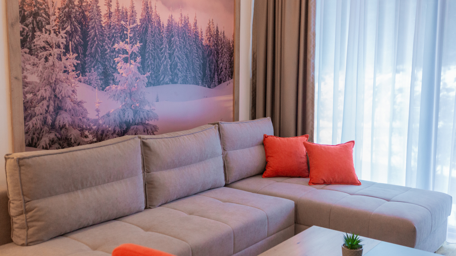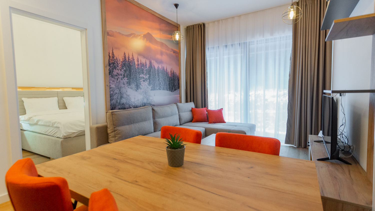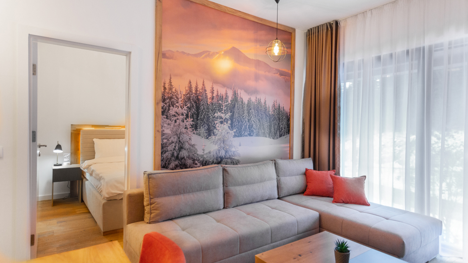 Luksuzno opremljeni enterijer podređen vašim potrebama sa zasebnom spavaćom sobom i dnevnim boravkom sa sofom, te opremljenom kuhinjom. Očarati će vas svojom udobnošću i prekrasnim pogledom na planinu. U apartmanu mogu boraviti do 5 osobe.Ekskluzivno opremljeni enterijer podređen vašim potrebama sa zasebnom spavaćom sobom i dnevnim boravkom sa sofom, te opremljenom kuhinjom. Očarati će vas svojom udobnošću i prekrasnim pogledom na planinu. U apartmanu mogu boraviti do 4 osobe.