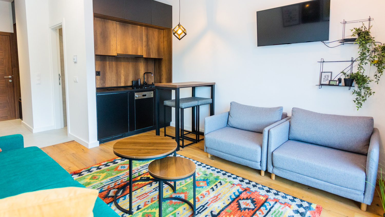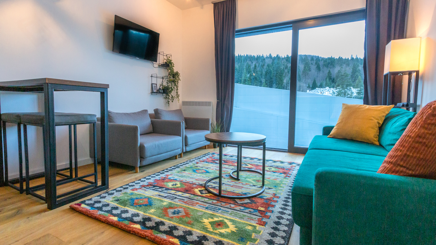 Elegantno opremljeni enterijer koji će vas očarati svojom udobnošću s prekrasnim pogledom na planinu. Apartman sa 1 sofom i dvije fotelje na razvlačenje, kupatilom i opremljenom kuhinjom. U apartmanu mogu boraviti do 4 osobe.