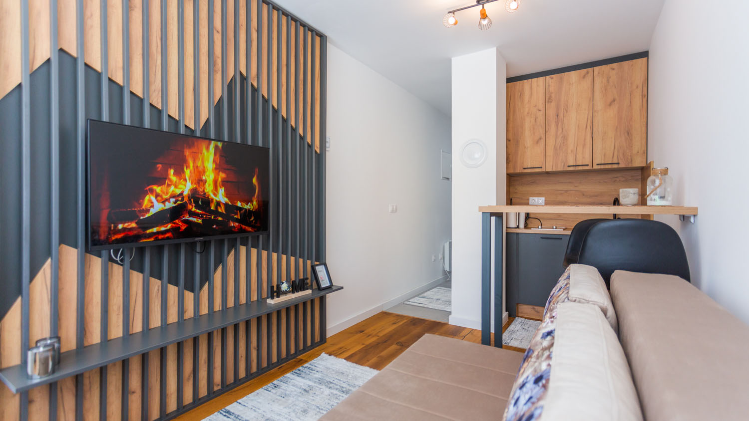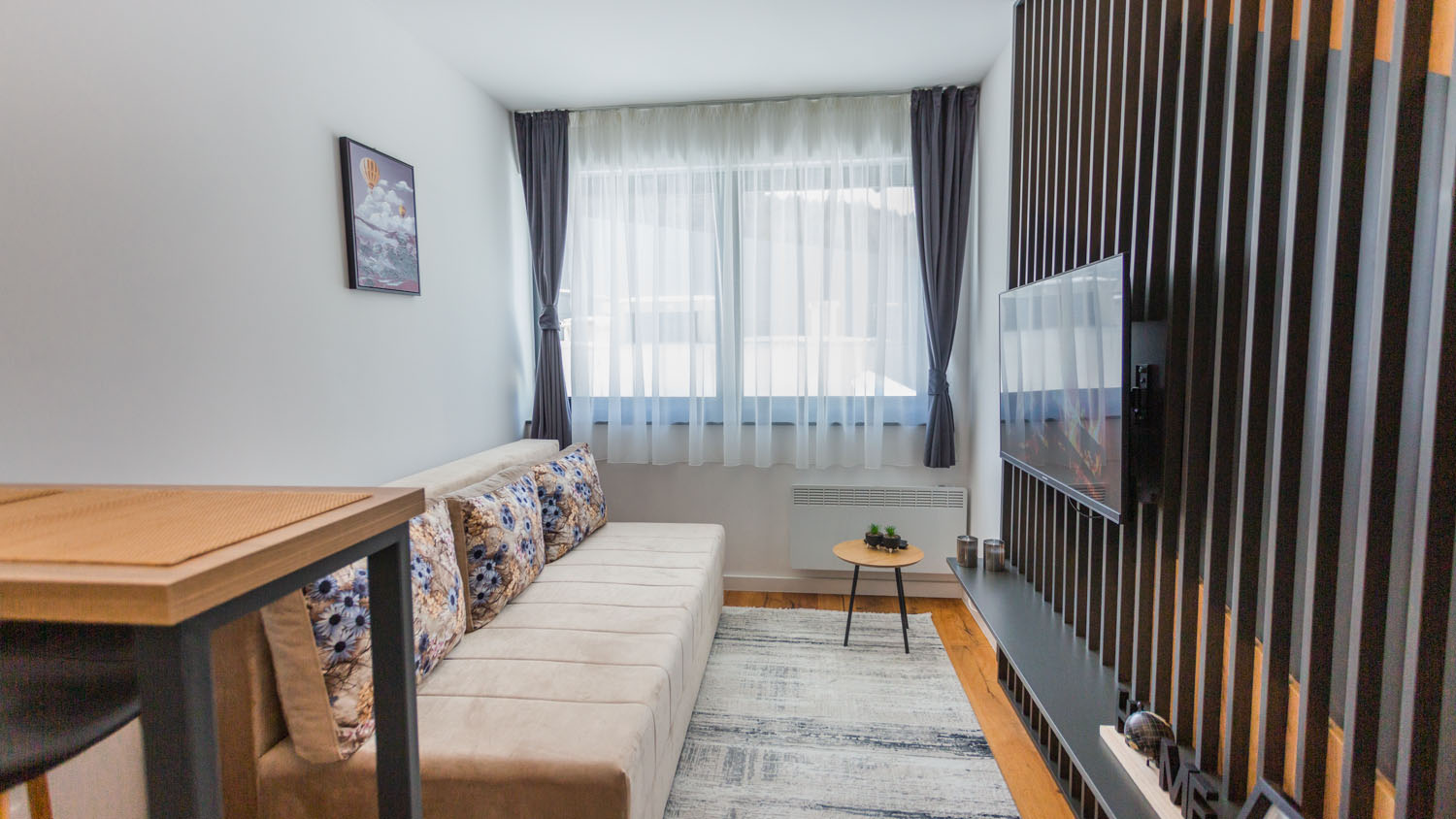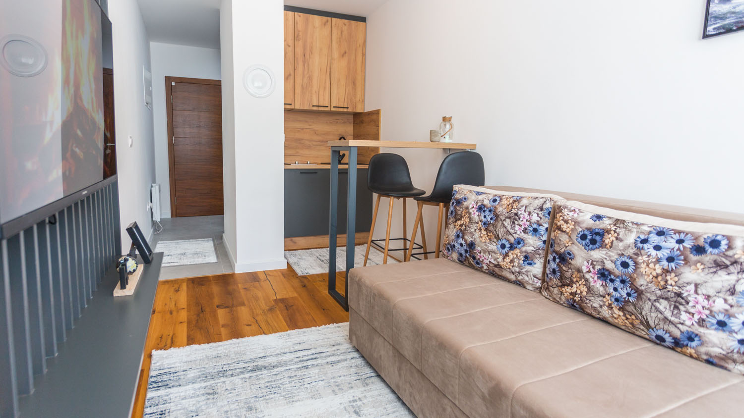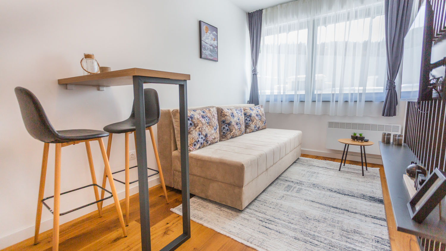 Elegantno opremljeni enterijer koji će vas očarati svojom udobnošću s prekrasnim pogledom na planinu. Apartman sa 1 sofom na razvlačenje, kupatilom i opremljenom kuhinjom. U apartmanu mogu boraviti do 2 osobe.