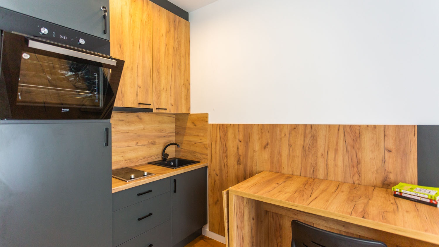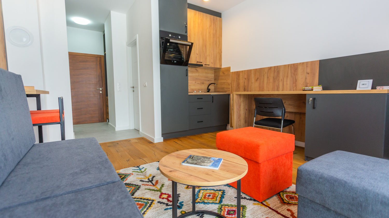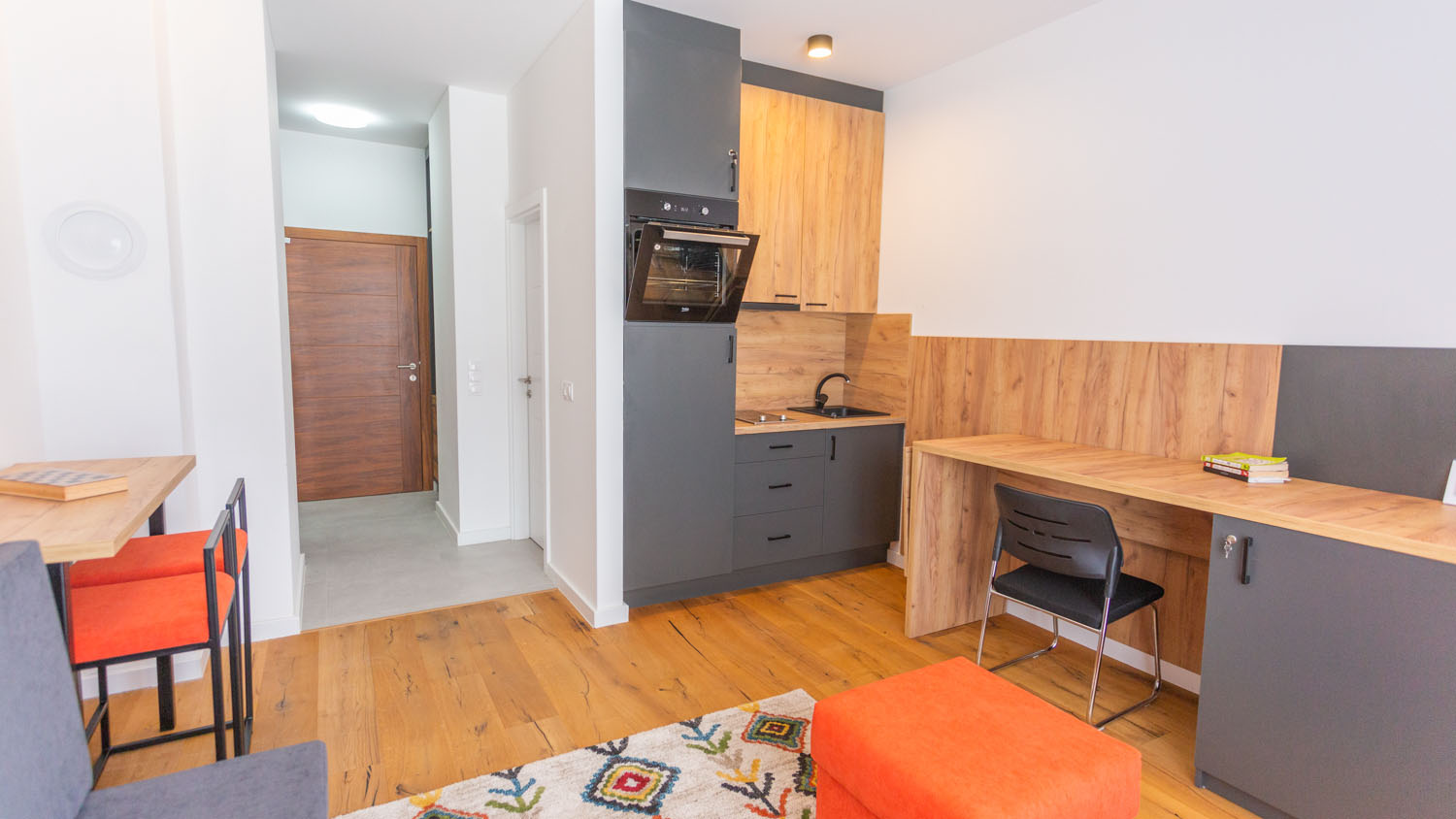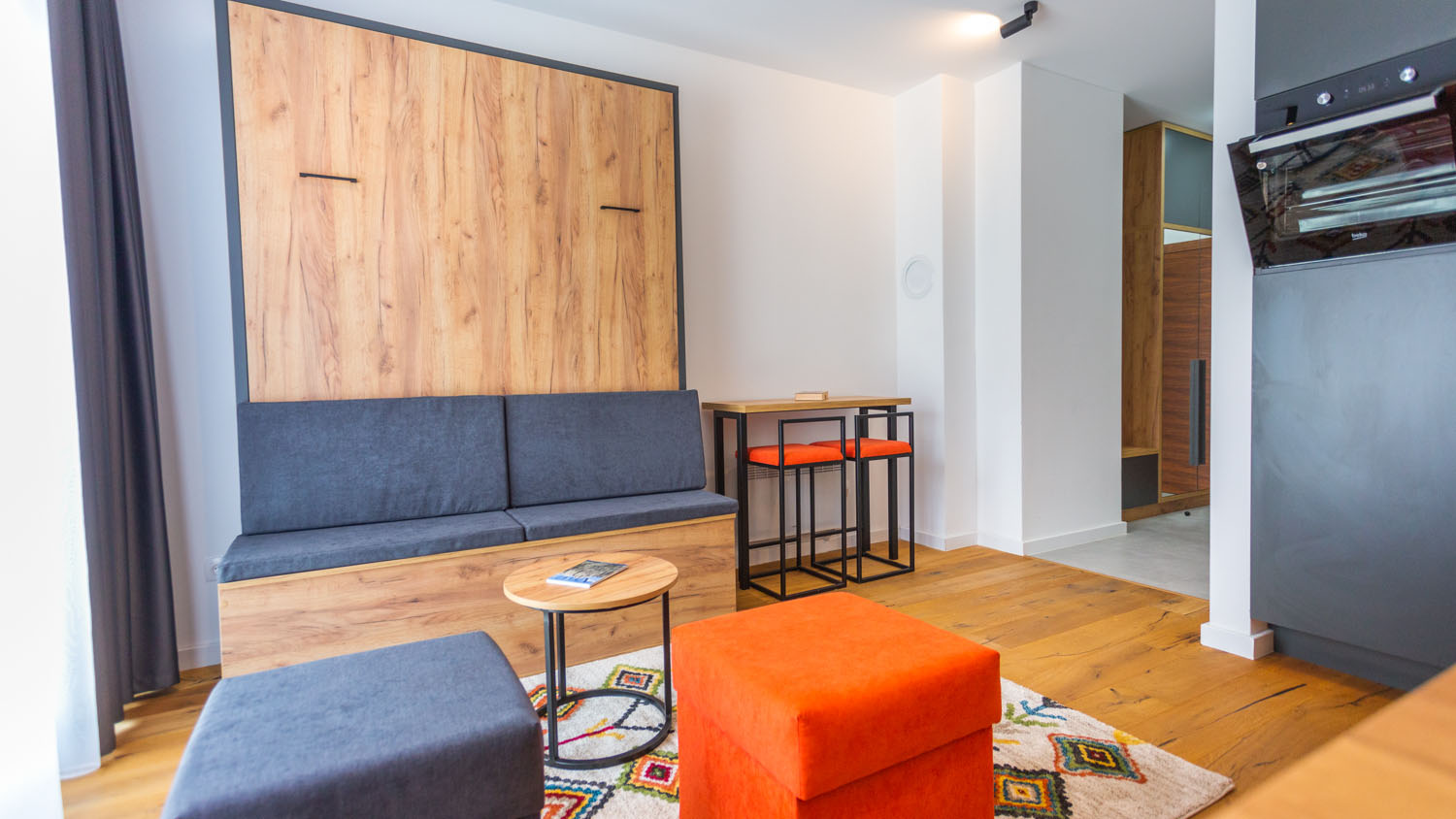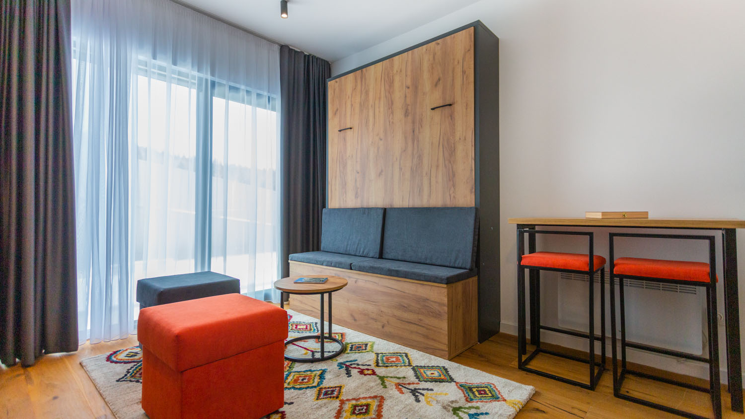 Elegantno opremljeni enterijer koji će vas očarati svojom udobnošću s prekrasnim pogledom na planinu. Apartman sa 1 zidnim krevetom, kupatilom i opremljenom kuhinjom. U apartmanu mogu boraviti do 2 osobe.