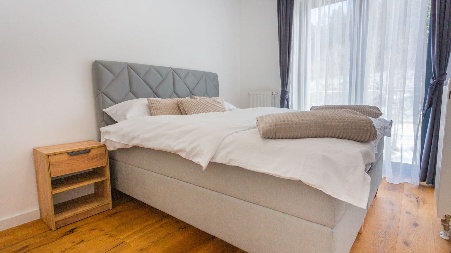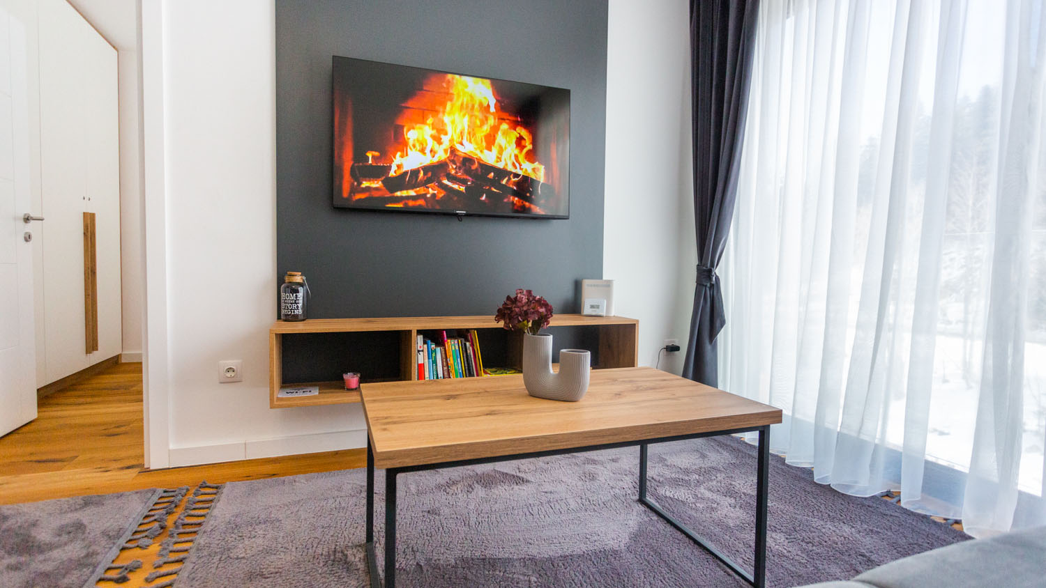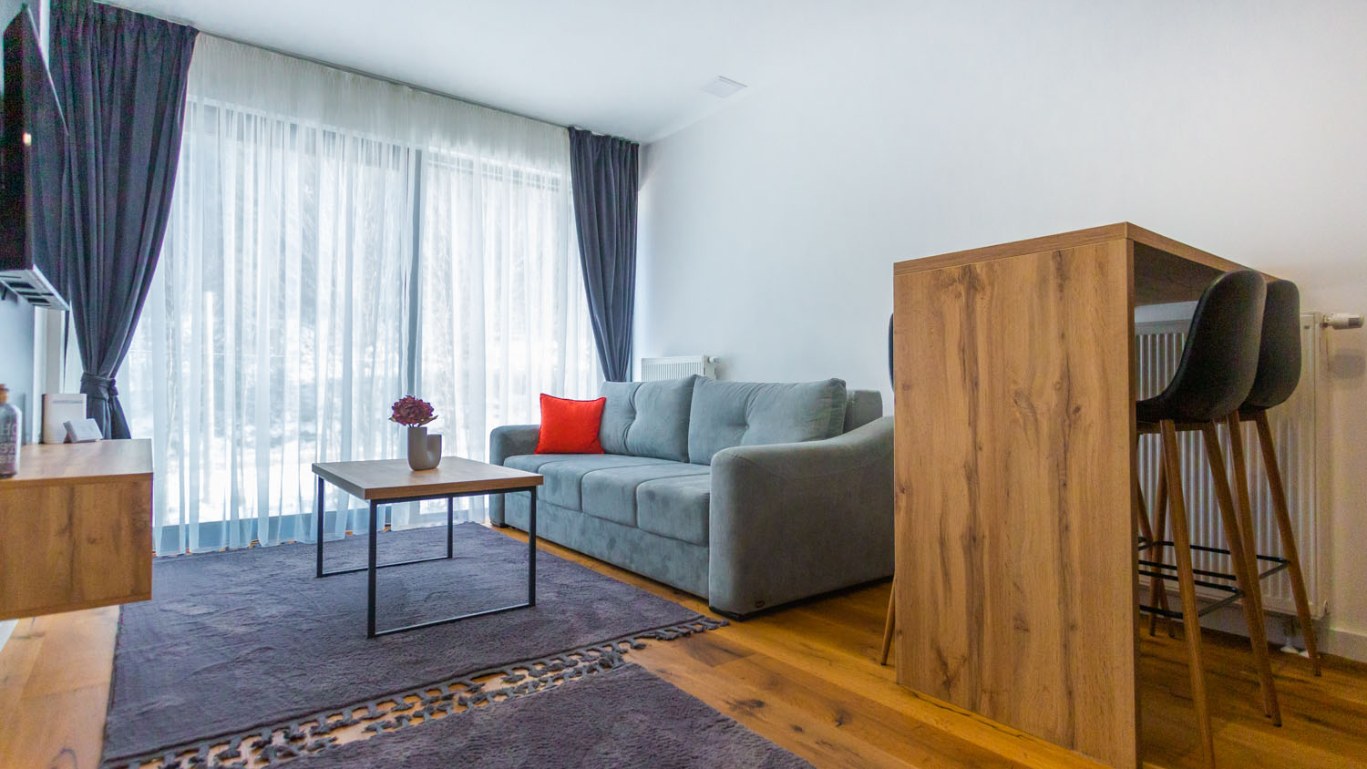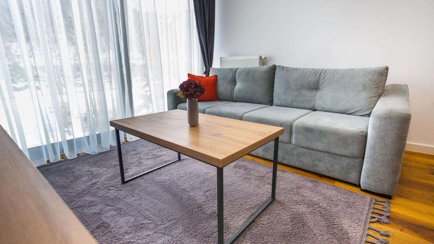 Elegantno opremljeni enterijer koji će vas očarati svojom udobnošću s prekrasnim pogledom na planinu. Apartman sa 1 zidnim krevetom, kupatilom i opremljenom kuhinjom. U apartmanu mogu boraviti do 2 osobe.Ekskluzivno opremljeni enterijer podređen vašim potrebama sa zasebnom spavaćom sobom i dnevnim boravkom sa sofom na razvlačenje, te opremljenom kuhinjom. Očarati će Vas svojom udobnošću i prekrasnim pogledom na planinu. U apartmanu mogu boraviti do 3 osobe.