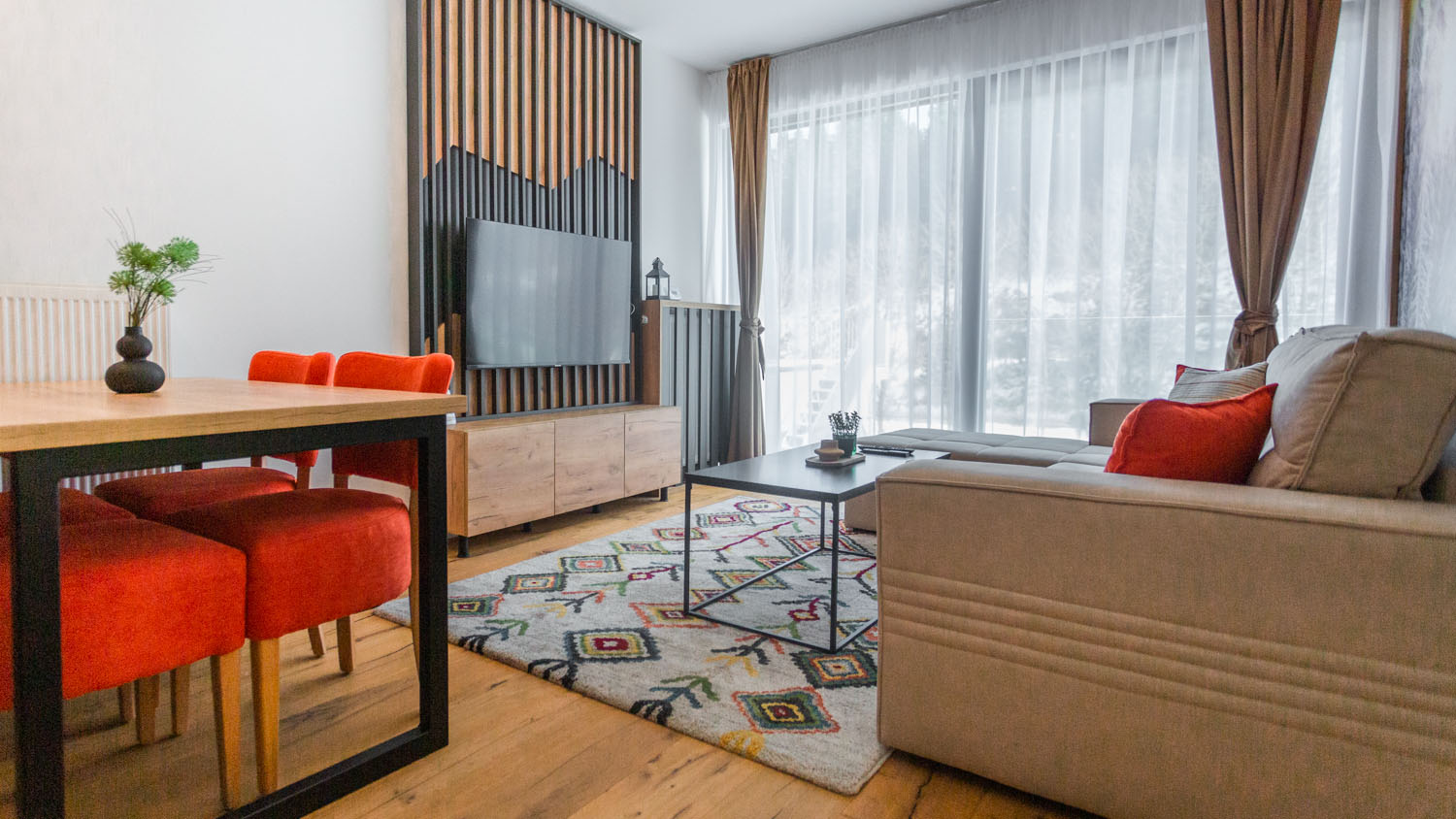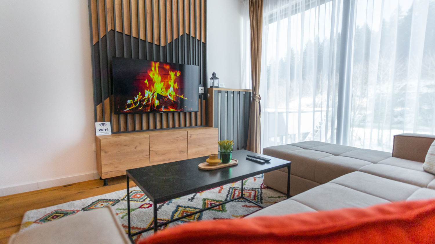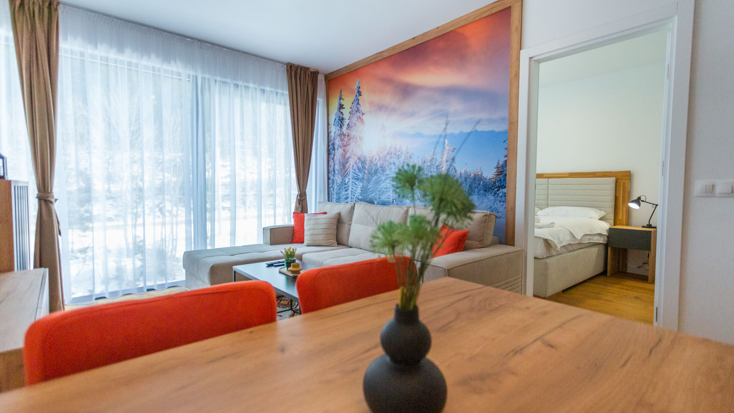 kskluzivno opremljeni enterijer podređen vašim potrebama sa zasebnom spavaćom sobom i dnevnim boravkom sa sofom na razvlačenje, te opremljenom kuhinjom. Očarati će vas svojom udobnošću i prekrasnim pogledom na planinu. U apartmanu mogu boraviti do 4 osobe.